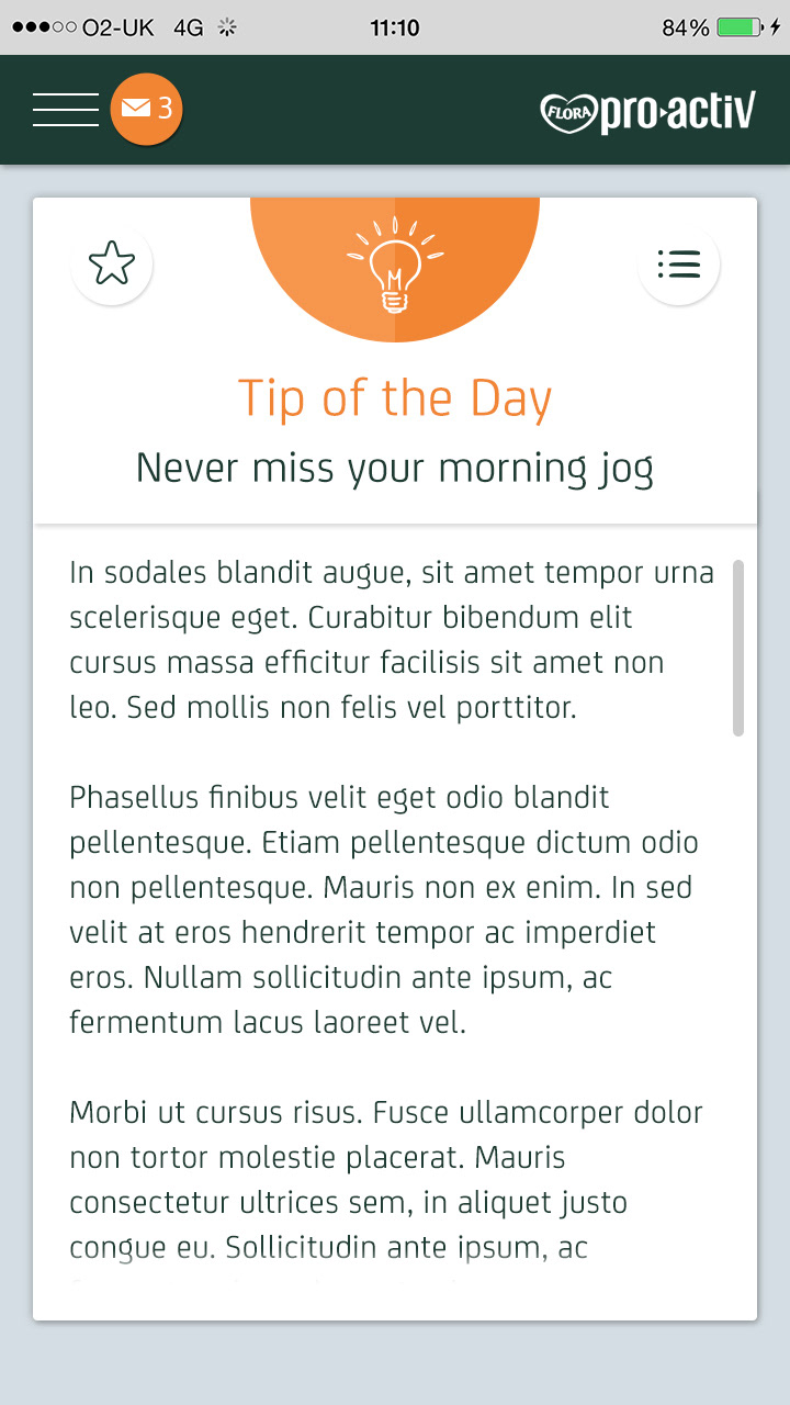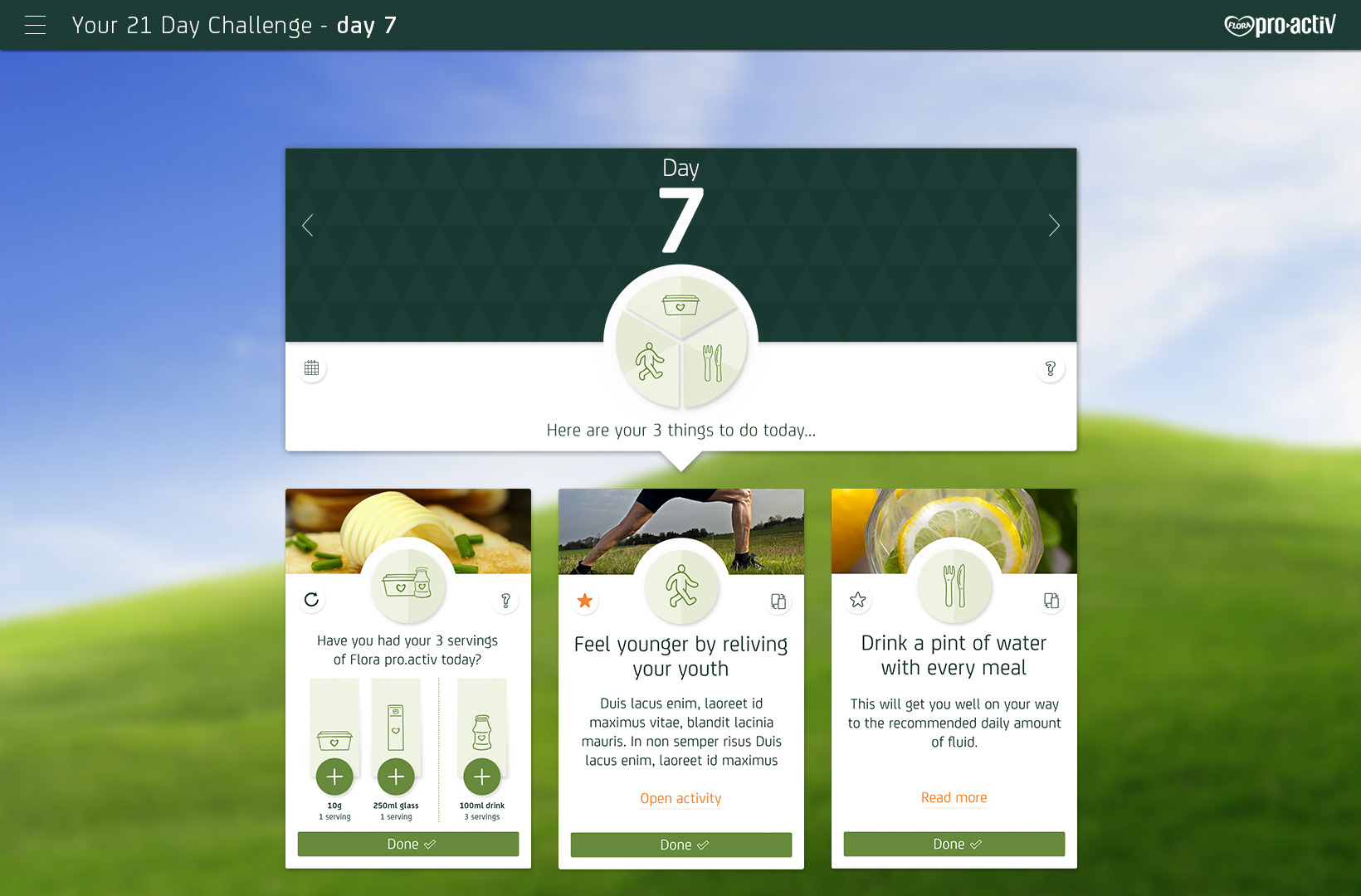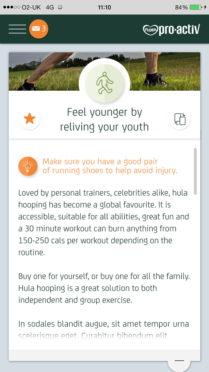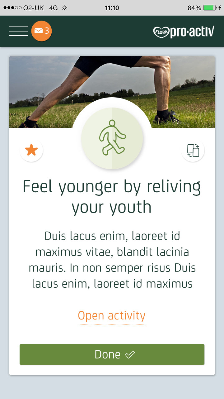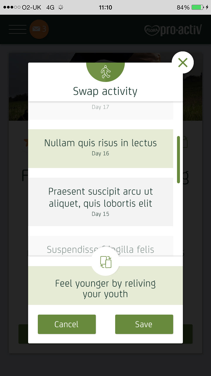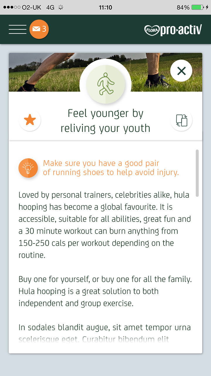 Flora Pro-Activ asked adam&eveDDB to design a 21 Day Challenge to encourage people to make small changes to their daily routine that can make a big difference to their health by lowering their cholesterol. The hope was that people would feel good about the changes and perhaps have some fun along the way.