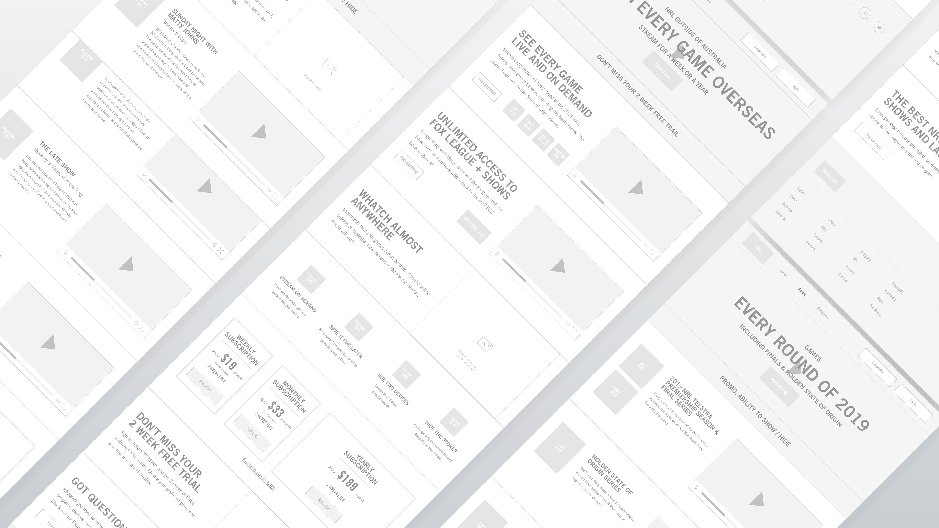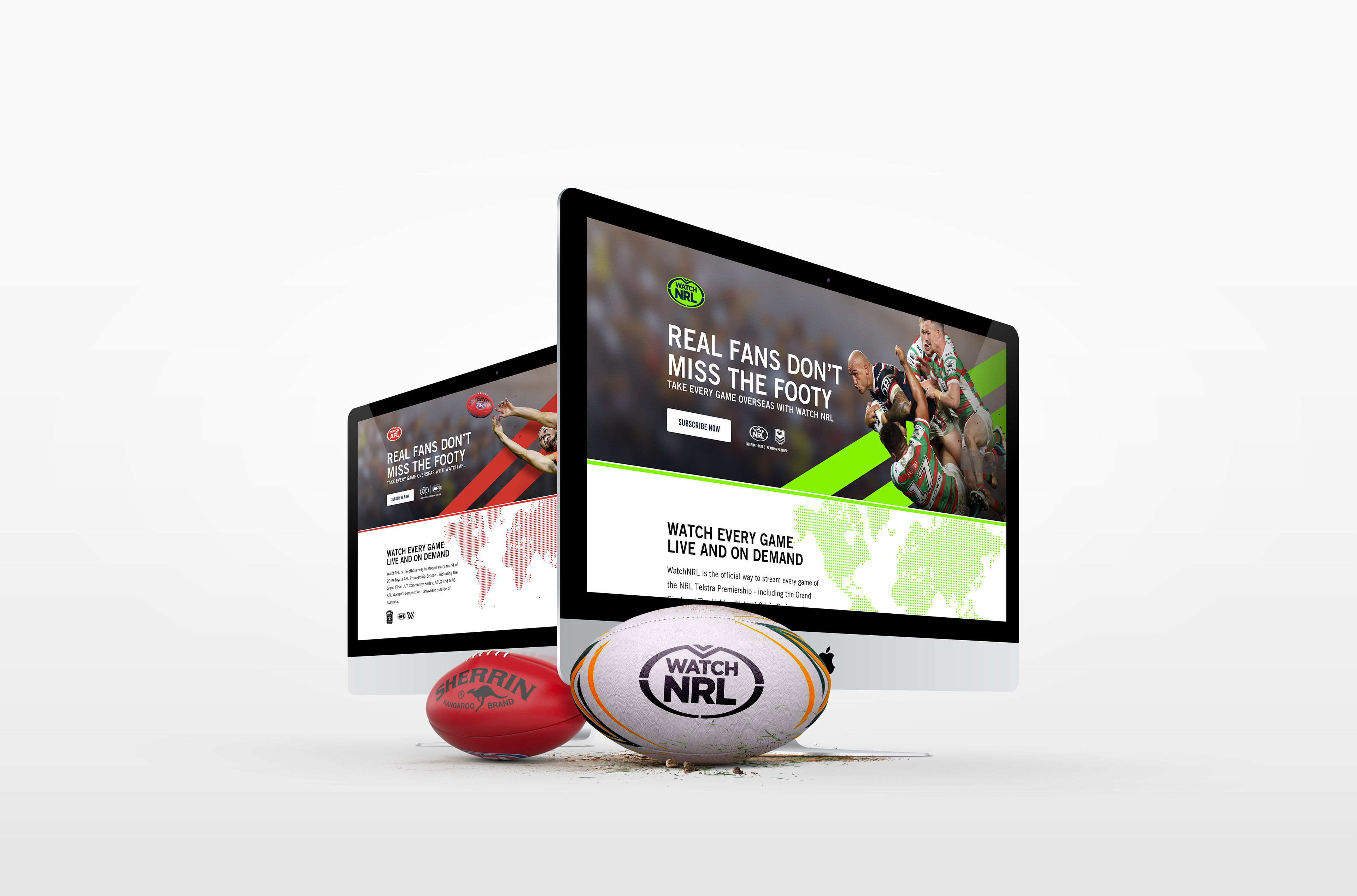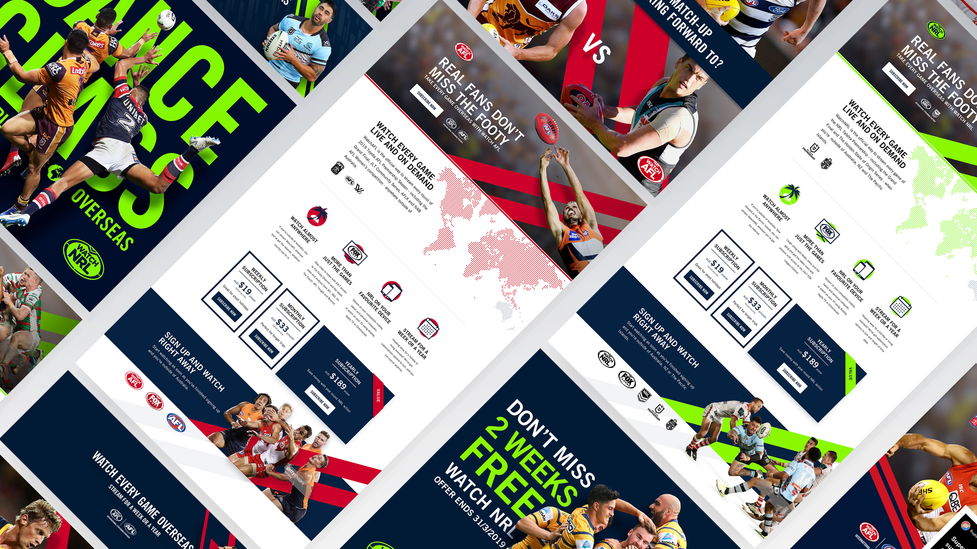 New landing page designs for the Watch AFL and NRL international streaming services. The pages put the focus back on their amazing products and their passion for footy.