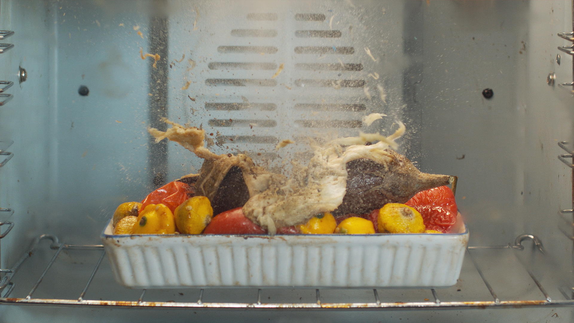 Originally we had planned to shot at 1000 fps but early testing revealed that was too slow to keep the action interesting, so the frame rate was reduced to between 250 and 500 depending on the scenario except for the vegetable exploding in the oven because that happened so quickly. Reducing the frame rate also had the desirable effect of reducing the size of our video files which sped up our workflow. eg a ten second shot at 1000 fps takes 7 minutes to playback at 24 fps.