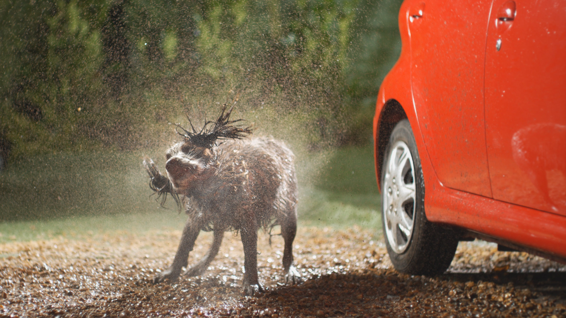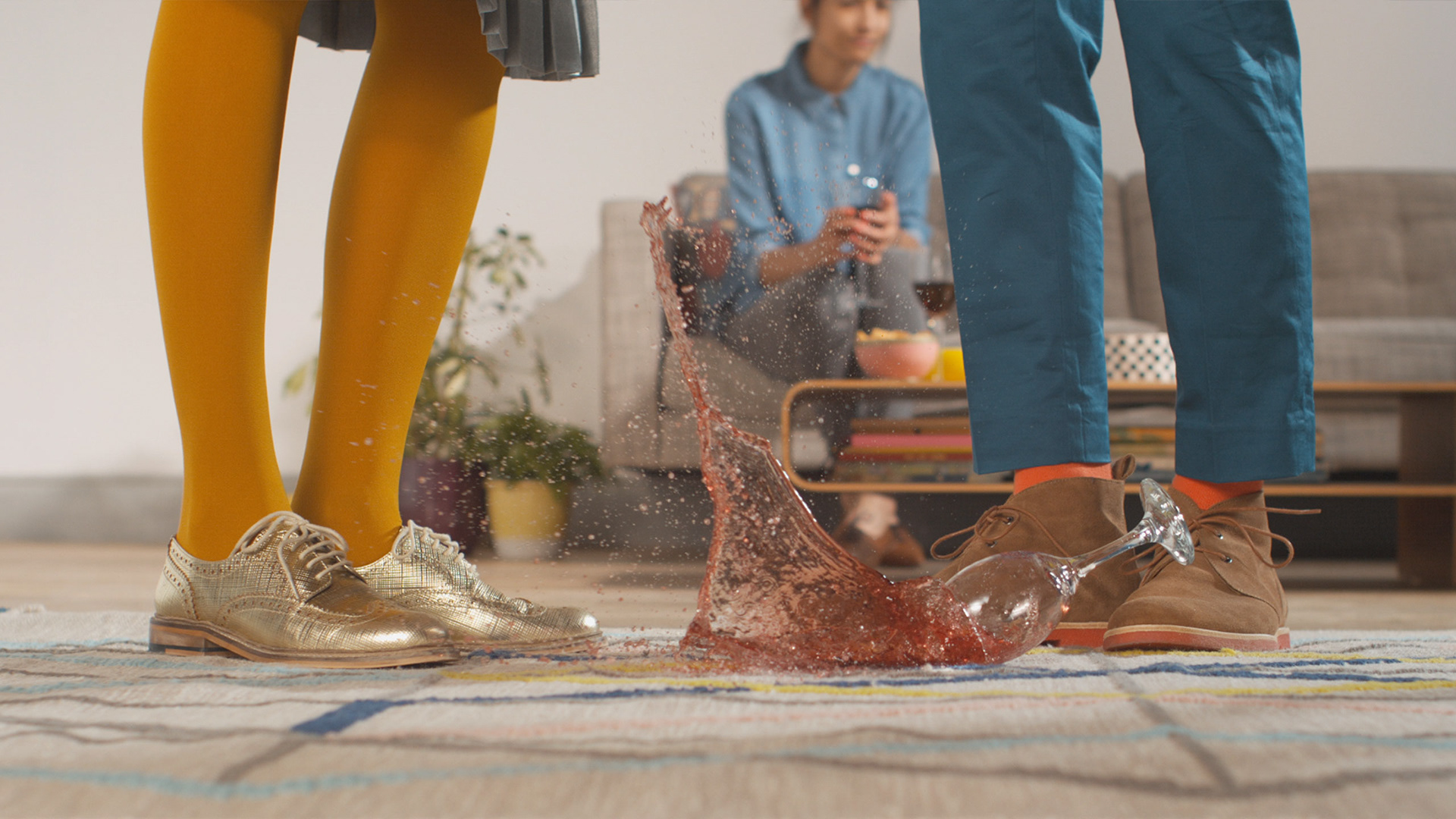 Our six scenarios were: a glass of red wine spilling on a rug, a dog shaking muddy water onto a clean car, a roasting vegetable exploding inside an oven, a shelf falling, wind breaking an umbrella and a mobile phone smashing on the ground. Each of these scenarios was challenging because it was difficult to control or replicate the key action which resulted in multiple takes and lots of replacement props.